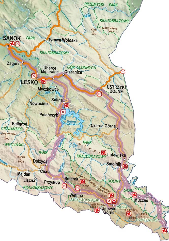 Sam dojazd w Bieszczady można potraktować już jako element przygody. Po drodze jest wiele ciekawych miejsc, gdzie można się zatrzymać. Sanok zapewne będzie pierwszym z nich. Oprócz oczywiście największego w Polsce skansenu można także pospacerować po sanockim rynku, przysiąść przy pomniku dzielnego Wojaka Szwejka, zaglądnąć do Galerii Beksińskiego w Muzeum Historycznym w Sanoku. Po takim spacerze trzeba usiąść i posilić się na dalszą drogę – najlepiej, żeby w karcie było coś z regionalnych podkarpackich smaków. W drodze do Ustrzyk Górnych można rozprostować nogi na krótkim spacerze przy Kamieniu Leskim czy podjechać do pokazowej zagrody żubrów w Mucznem. Dla miłośników architektury drewnianej Bieszczady będą rajem. Po drodze, nawet przy samej obwodnicy bieszczadzkiej, natkniemy się na wiele perełek w postaci drewnianych świątyń.